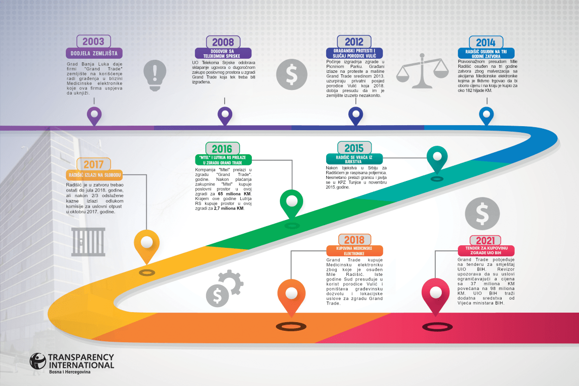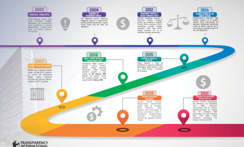 Studija koju je objavio TI BIH pokazuje da su prve afere oko ovog projekta počele još 2003. godine dodjelom gradskog zemljišta ovoj firmi na korišćenje, koje je uknjiženo kao stvarno vlasništvo, a onda prošireno na privatne posjede i zemljište Medicinske elektronike. Štetu fizičkim licima nadoknadili su građani iz budžeta, a zbog nezakonitog ustupanja zemljišta Medicinske elektronike osuđen je bivši direktor Ratko Stamenić. Zbog malverzacija akcijama ovog javnog preduzeća na kraju je na tri godine zatvora osuđen i sam vlasnik firme „Grand Trade“ Mile Radišić koji je nakon pravosudne farse, bjekstva od izdržavanja kazne i prijevremenog puštanja na slobodu, ipak uspio da kupi Medicinsku elektroniku koja je do tada već bila uništena.
