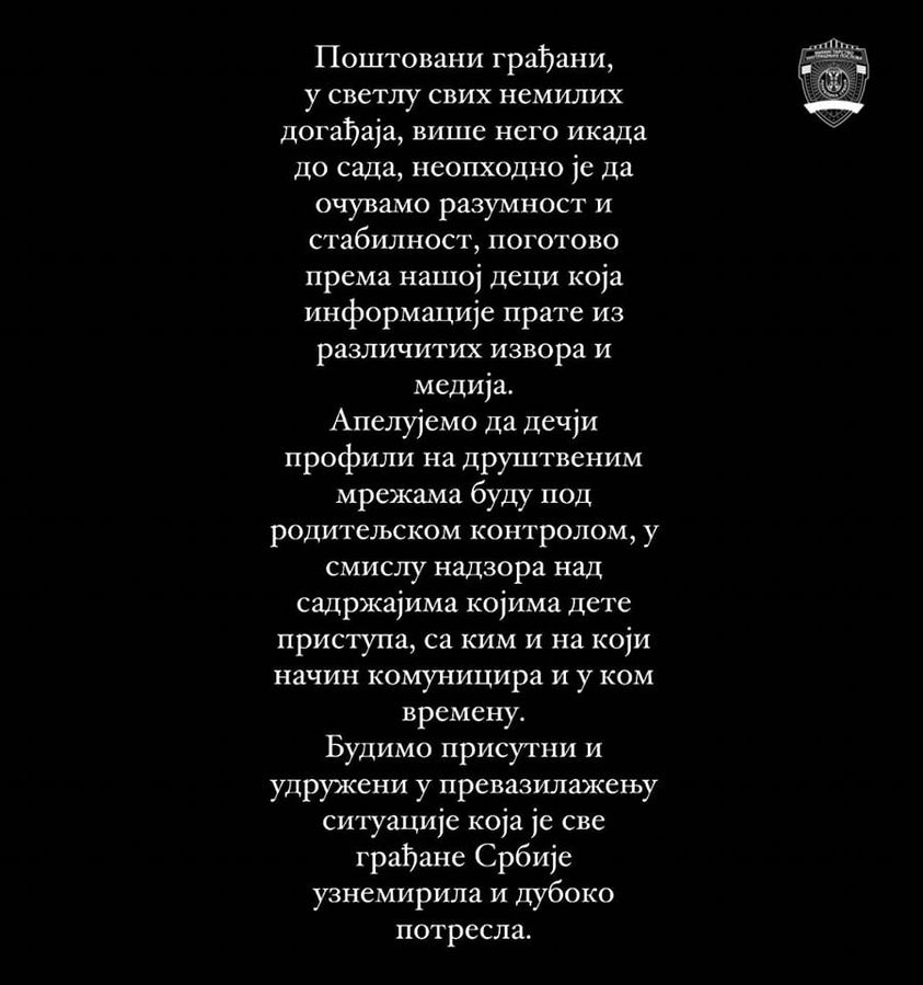 – Poštovani građani, u svetlu svih nemilih događaja, više nego ikada do sada, neophodno je da očuvamo razumnost i stabilnost, pogotovo prema našoj deci koja informacije prate iz različitih izvora i medija – navodi se u saopštenju MUP-a.