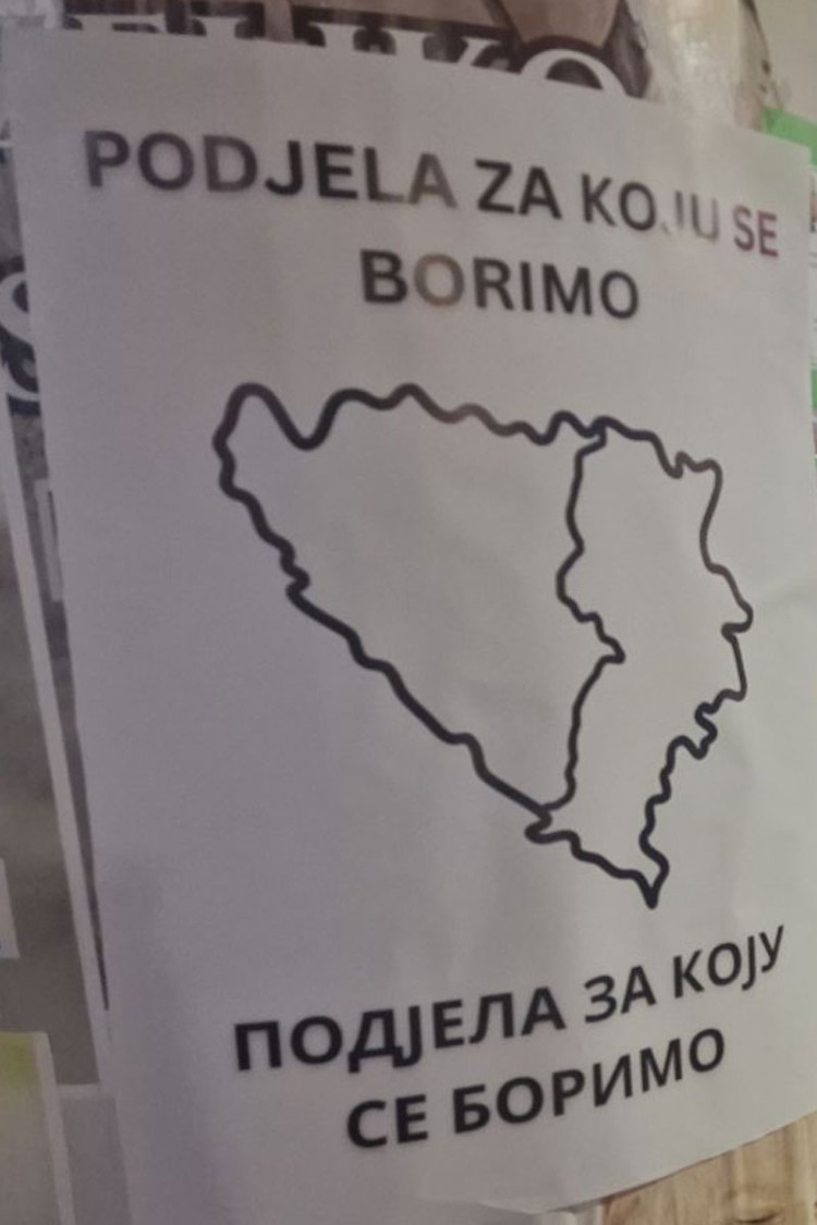 Na ulicama Brčkog, Tuzle i Bijeljine jutros su osvanuli izlijepljeni plakati na kojima je ucrtana karta Bosne i Hercegovine, ali uz veliku graničnu liniju povučenu od sjevera ka jugu koja državu dijeli na dva dijela, kao i porukom "Podjela za koju se borimo", koja je ispisana na ćirilici i latinici.