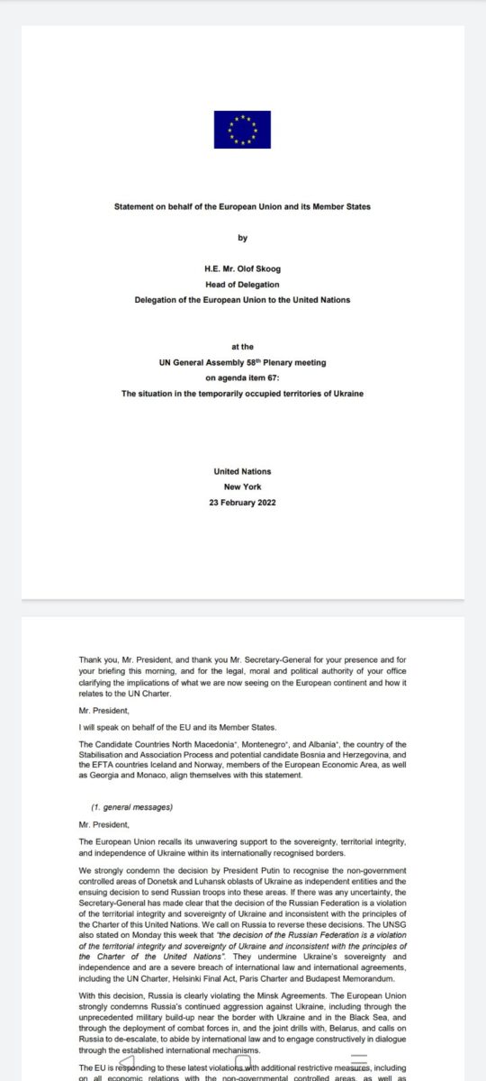 U Izjavi se, između ostalog, oštro osuđuje odluku predsjednika Rusije, Vladimira Putina, da prizna područja Donjeck i Lugansk u Ukrajini kao nezavisne republike i odluku o slanju ruskih trupa u ove oblasti.