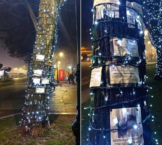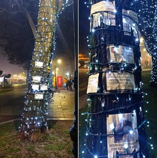 Na društvenim mrežama dijele se fotografije na kojima se vidi ukrašeno stablo koje inače služi kao oglasna tabla na koju se kače umrlice mještana. Lampice su prosto obmotane preko umrlica i oglasa.