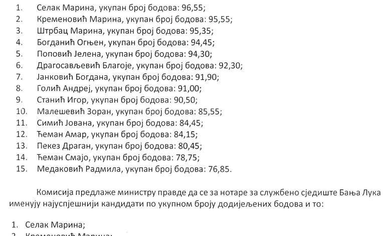 Među 15 kandidata na konkursu za izbor notara za sjedište u Banjoj Luci najbolje ocjene dobili su Marina Selak, Marina Kremenović, Marina Štrbac, Ognjen Bogdanić i Jelena Popović.