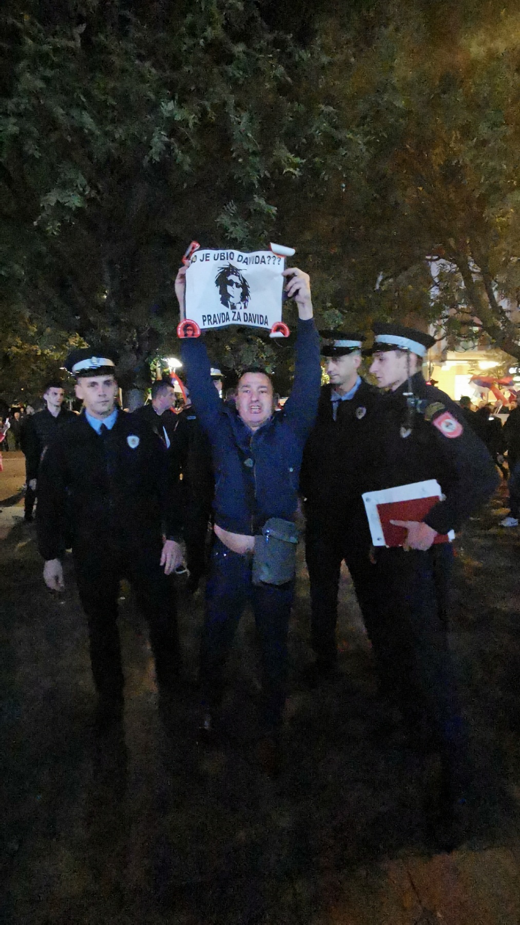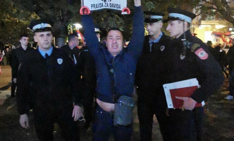 Davor je nosio transparent na kojem je pisalo "Ko je ubio Davida? Pravda za Davida!".