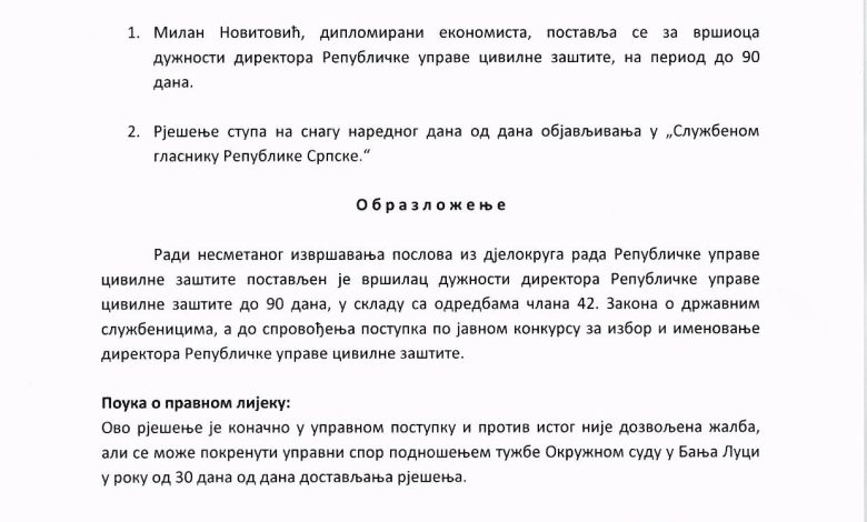 Međutim, presuda za krivično djelo nije spriječila Radovana Viškovića, predsjednika Vlade Republike Srpske da 18. marta ove godine Novitoviću produži mandat na mjestu direktora Republičke uprave Civilne zaštite RS.