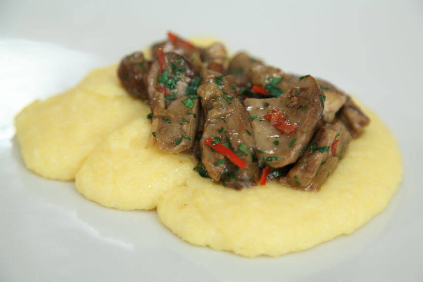 Očistite vrganje, ljutu papričicu i bijeli luk. Narežite vrganje, a ljutu papričicu i bijeli luk nasjeckajte. U lonac stavite vodu dok ne zavrije pa u to dodajte trećinu maslaca i kukuruznu krupicu. Posolite i miješajte sve dok se ne napravi palenta. Najbolje bi bilo da pratite uputstva na pakovanju. U gotovu palentu dodajte naribani sir i promiješajte. Maknite lonac s vatre. Na ugrijanu tavu stavite drugu trećinu maslaca i pričekajte da se otopi. Na to dodajte sjeckanu ljutu papriku i bijeli luk pa pržite još 2 minute. Na to dodajte vrganje, sol i biber. Promiješajte i smanjite vatru na slabiju. Nakon 2 minute dodajte bijelo vino i povremeno miješajte na srednje jakoj vatri oko 4 minute. Kada vino ispari do pola, dodajte ostatak maslaca i sjeckani peršun. Promiješajte i maknite s vatre. Kada poslužujete prvo stavite palentu pa preko nje prelijte pikantne vrganje.