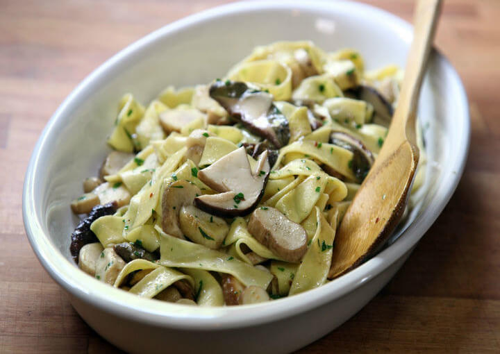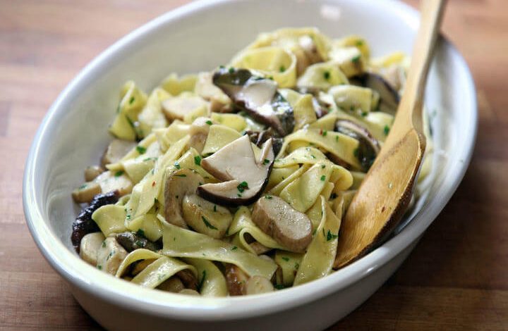 Očistite vrganje i narežite ih. U loncu skuhajte tjesteninu s malo soli. Pratite uputstva na pakovanju. U međuvremenu u tavu na vatri stavite maslac da se otopi. Na to ulijte 3 kašike ekstra djevičanskog maslinovog ulja, dodajte narezane vrganje. Pomiješajte i pirjajte na srednje jakoj vatri oko 3 minute. Tjesteninu ocijedite i premjestite u tavu s vrganjima. Na to stavite malo maslinovog ulja, začinite ljutom paprikom, sjeckanim peršunom, solju i biberom. IzmIješajte. Vaše jelo je gotovo i možete ga poslužiti.