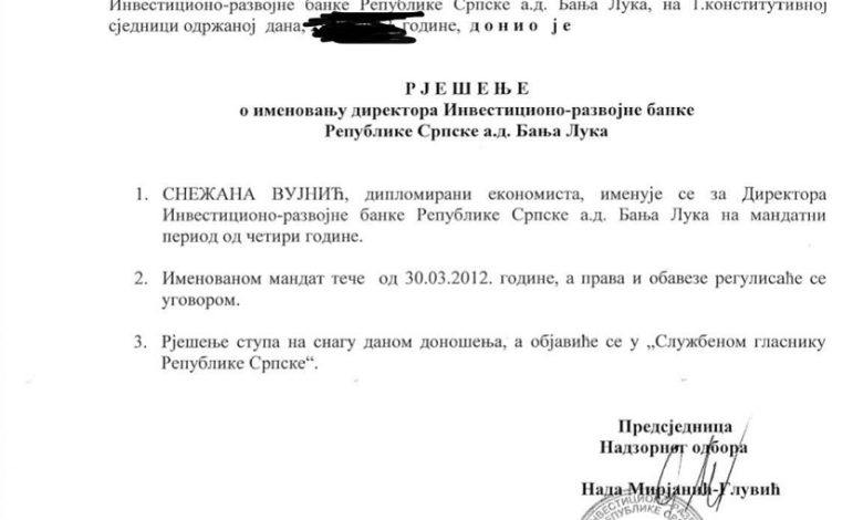 Ovo potvrđuje dokument koji je u posjedu eTrafike, a koji nedvosmisleno pokazuje od kada do kada je Vujnićka bila ovlašćena za potpis na odobrene kredite. Ona je 30. marta 2012. godine imenovana na mjesto direktora IRB-a RS, a mandat joj je istekao tačno četiri godine kasnije, nakon čega nije produžen. Vujnićka stoga nije mogla da potpisuje kreditna zaduženja, iako je sa tim nastavila pune četiri godine.