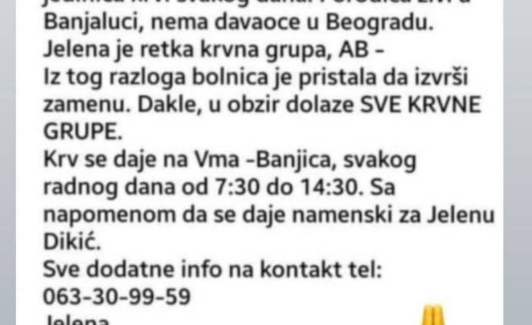 – Jelena je rijetka krva grupa – AB. Iz tog razloga bolnica je pristala da izvrši zamjenu. Iz tog razloga u obzir dolaze sve krvne grupe – piše u apelu.