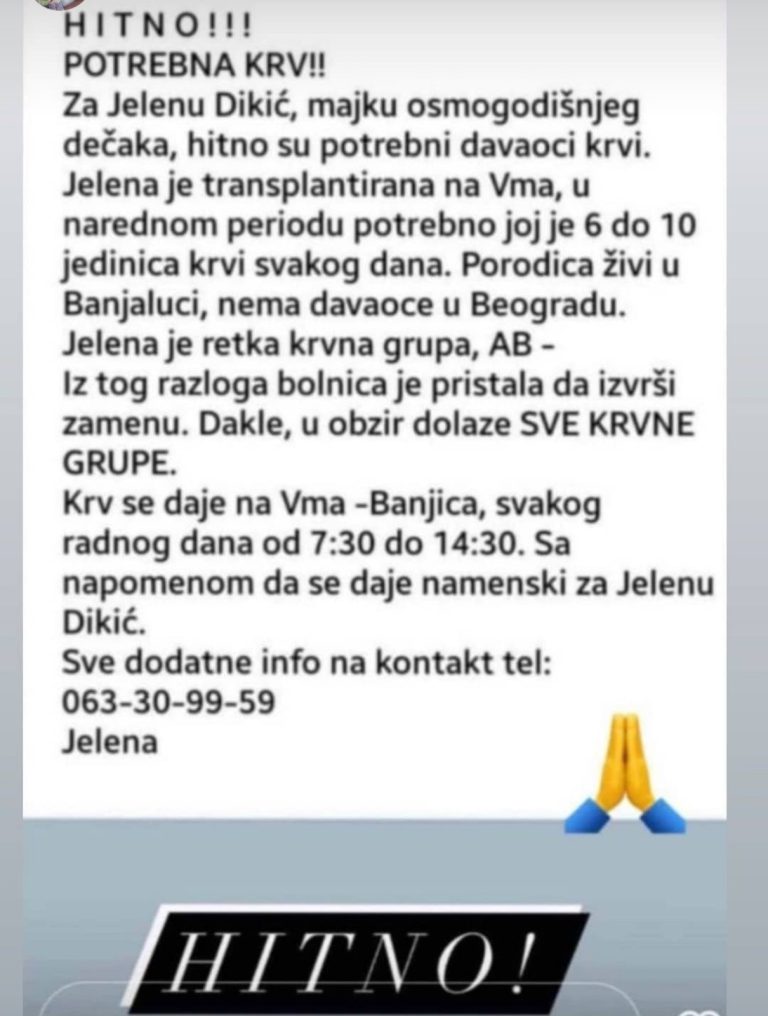 Jelena je transportovana na VMA u Beogradu, a u narednom periodu potrebno joj je šest do 10 jedinica krvi svakog dana. Kako se dalje navodi, majka osmogodišnjaka nema davaoce u Beogradu. Porodica joj žvi u Banjoj Luci.
