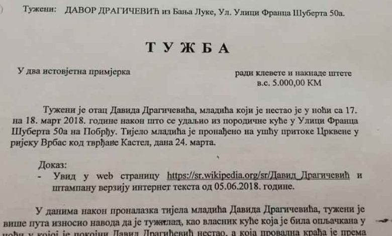 Đorđe Rađen podnio je tužbu protiv Davora Dragičevića, oca ubijenog Davida, zbog klevete i traži isplatu odštete u iznosu od 5.000 KM.