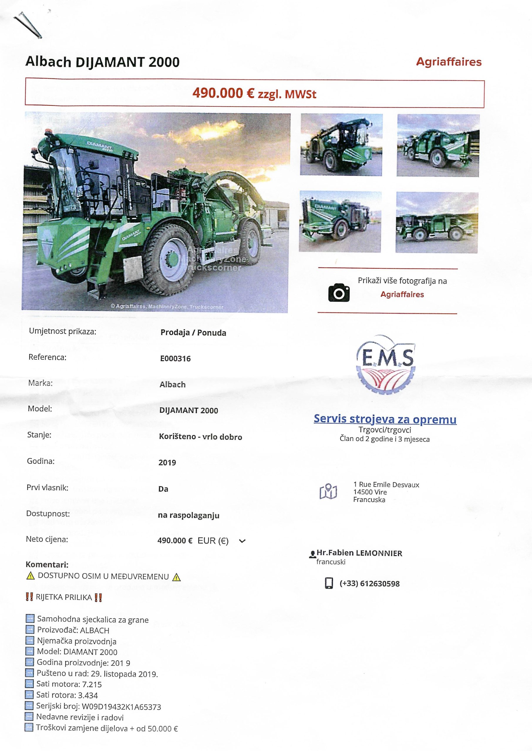 Ni druga ponuda nije puno uvjerljivija. Riječ je o oglasu sa francuskog sajta za prodaju poljoprivrednih mašina gdje se pomenuta mašina proizvedena 2019. godine nudi za 490.000 evra.