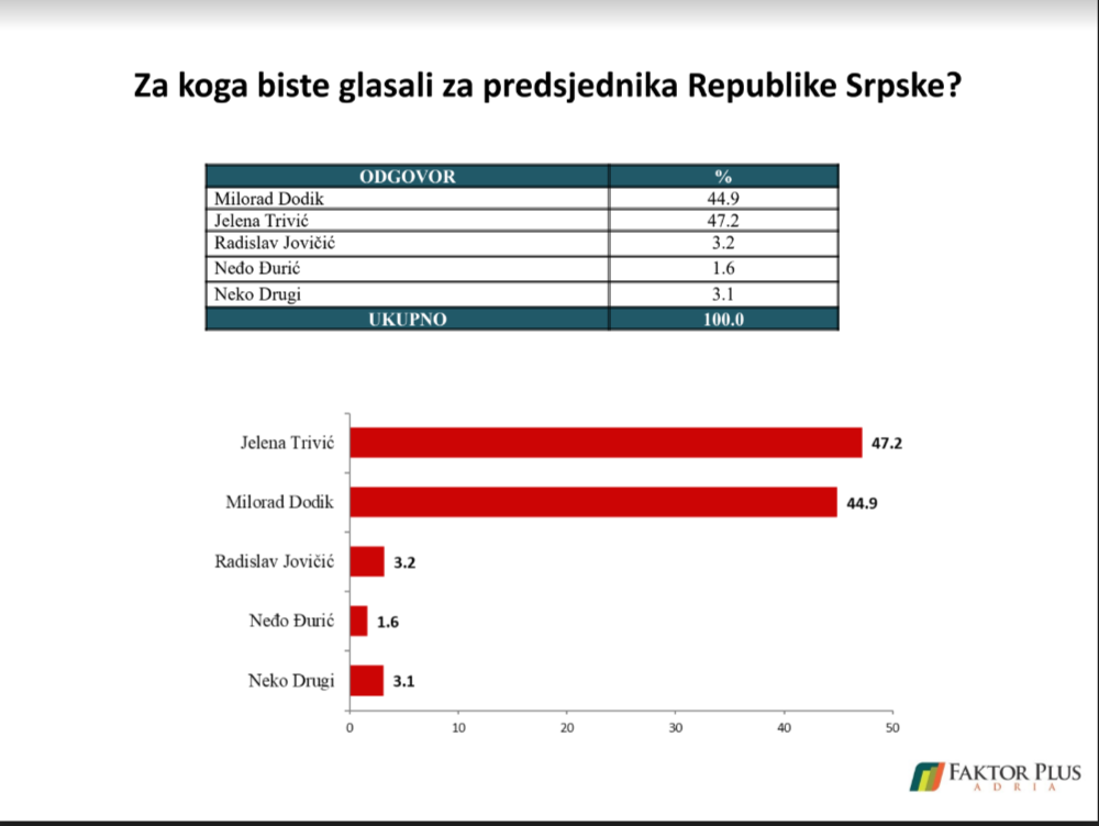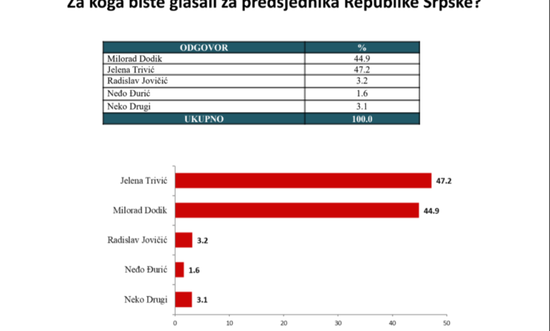 Kandidat opozicije za predsjednika Republike Srpske Jelena Trivić ima podršku 47,2, a kandidat SNSD-a Milorad Dodik 44,9 birača, pokazuje istraživanje beogradske agencije Faktor plus koje je rađeno na teritoriji cijele Republike Srpske u periodu od 5. do 15. septembra na uzorku od 3.000 ispitanika.