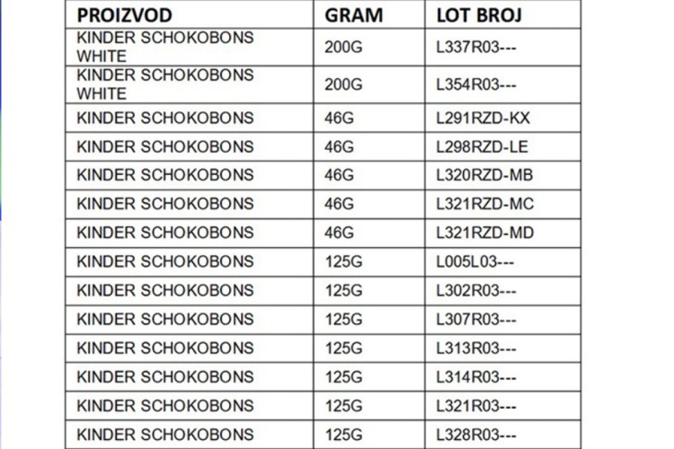 Ferero je kao mjeru opreza odlučio dobrovoljno da povuče iz prodaje u BiH proizvod Kinder škobons sa sljedećim lot brojevima, proizveden u Belgiji: