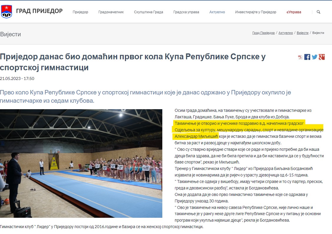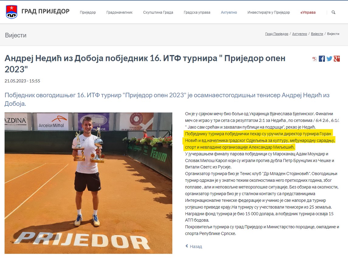 Tako se u vijesti objavljenoj na gradskom sajtu od 21. maja navodi da je “vd.načelnika gradskog Odjeljenja za kulturu, međunarodnu saradnju, sport i nevladine organizacije Aleksandar Milješić uručio pehar pobjedniku turnira “Prijedor open 2023””.