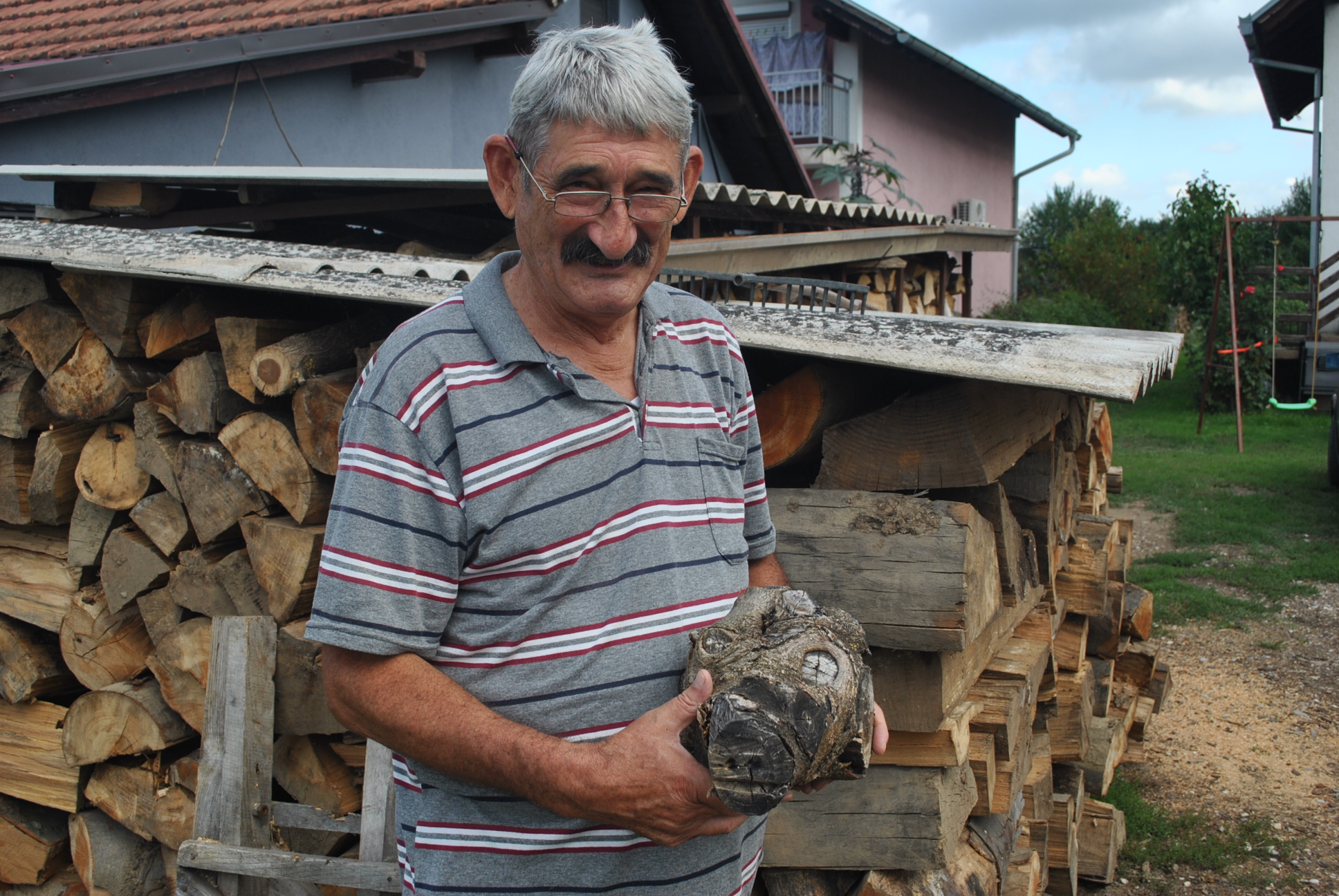 U dvorištu nema čega nema. U zemljanom loncu kuva sarmu, grah ili kiseli kupus. Pripremajući drva za zimu u jednom panju prepoznao je skulpturu svinje, a iza kuće u bašti uzgaja džinovsku tikvu ili misiraču. Kaže da će je izložiti na vašaru za Malu Gospojinu.