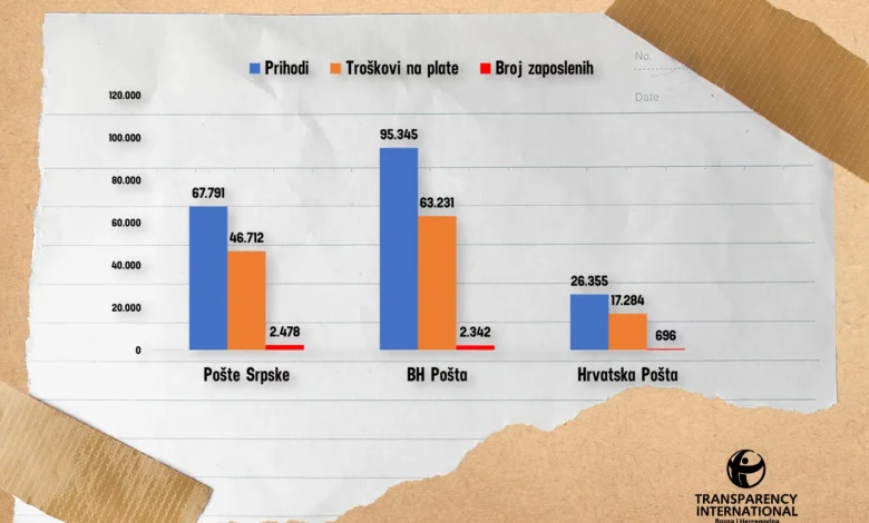 Tako Pošte Srpske danas imaju oko 130 zaposlenih više nego BH Pošta koja ima gotovo 30 miliona veće prihode. Ipak, iako BH Pošta i dalje posluju pozitivno i ostvaruju značajne prihode, kroz nabavke i donacije ogromna sredstva izdvaja za finansiranje raznih udruženja, sportskih klubova i vjerskih zajednica. Hrvatska pošta Mostar posluje sa malim profitom iako revizori smatraju da je i on precijenjen a brojni su primjeri nesvrsishodnog trošenja novca ovog javnog preduzeća.
