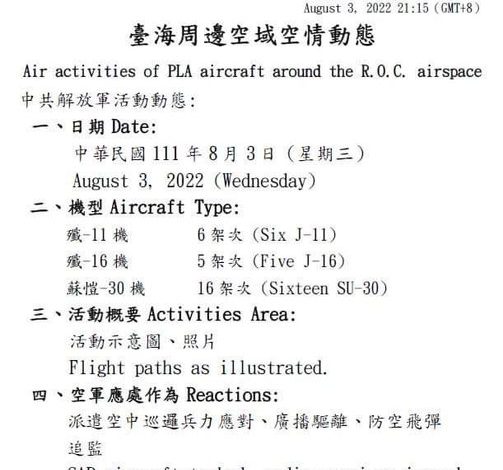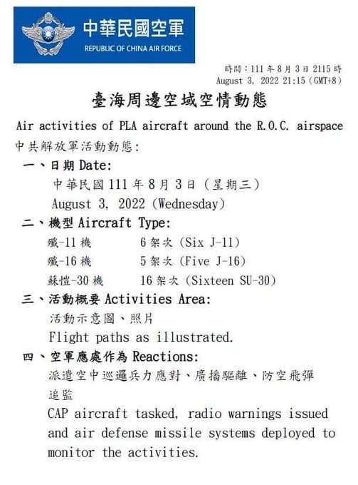 Ministarstvo odbrane Tajvana saopštilo je ranije da će to ostrvo čvrsto braniti svoju bezbjednost, suprotstaviti se svakom potezu koji narušava njegov teritorijalni suverenitet i da će vojska podići "nivo budnosti" na takav način da to neće provocirati sukobe, prenosi Rojters.