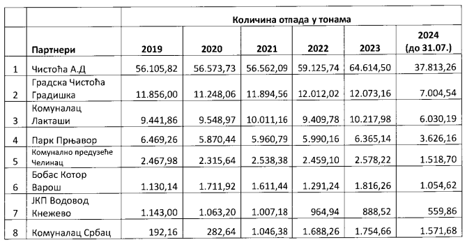 Iz Laktaša je dovezeno 10.217 tona, a iz Prnjavora „samo“ 6.365 tona. Komunalno preduzeće Čelinac dovezlo je 2.578 tona, dok je iz Kotor Varoša dovezeno 1.816. tona. Manje smeća nego iz Čelinca dovezeno je iz opštine Srbac (1.754 tone), iako Srbac ima nekoliko hiljada stanovnika više. Najmanje smeća ili preciznije 888 tona dovezeno je iz Kneževo.