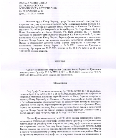 Nakon što je Okružni sud u Banjoj Luci ukinuo ranije rješenje kotorvaroškog Osnovnog suda i vratio predmet na ponovni postupak, ovaj sud je presudio u korist otpuštenih vatrogasaca Petka Božičkovića, Radojka Keverovića i Ljube Popovića.