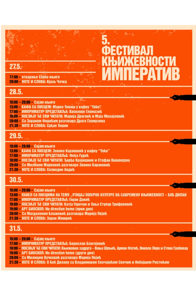 – Oprečni stavovi da li je Dilanova poezija književnost ili nije i danas su tema svjetske književne kritike. Tokom pet dana Banja Luka će biti književni centar u kojem će se okupiti više od 30 značajnih domaćih i regionalnih pisaca. Njihov rad biće predstavljen kroz pet programskih sadržaja – saopšteno je iz Udruženja za promociju i popularizaciju književnosti "Imperativ".