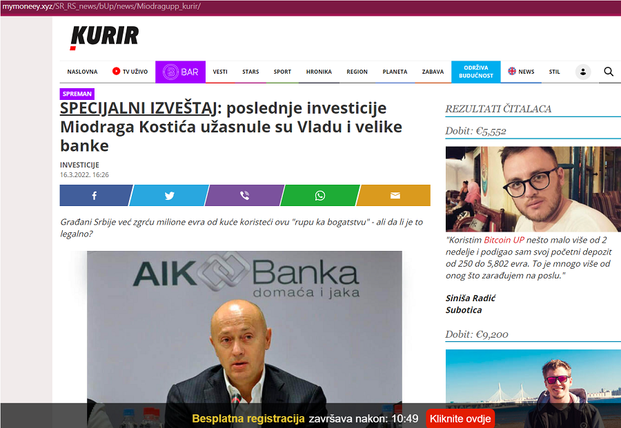 – Konačno mogu da dam otkaz na poslu samo zahvaljujući platformi Bitcoin UP. Napravio sam tako mnogo, a tako lako! – pohvalio se na jednom od najposećenijih novinarskih portala Matija Stević iz Novog Sada tvrdeći da je zaradio 41 hiljadu evra na kriptovalutama.