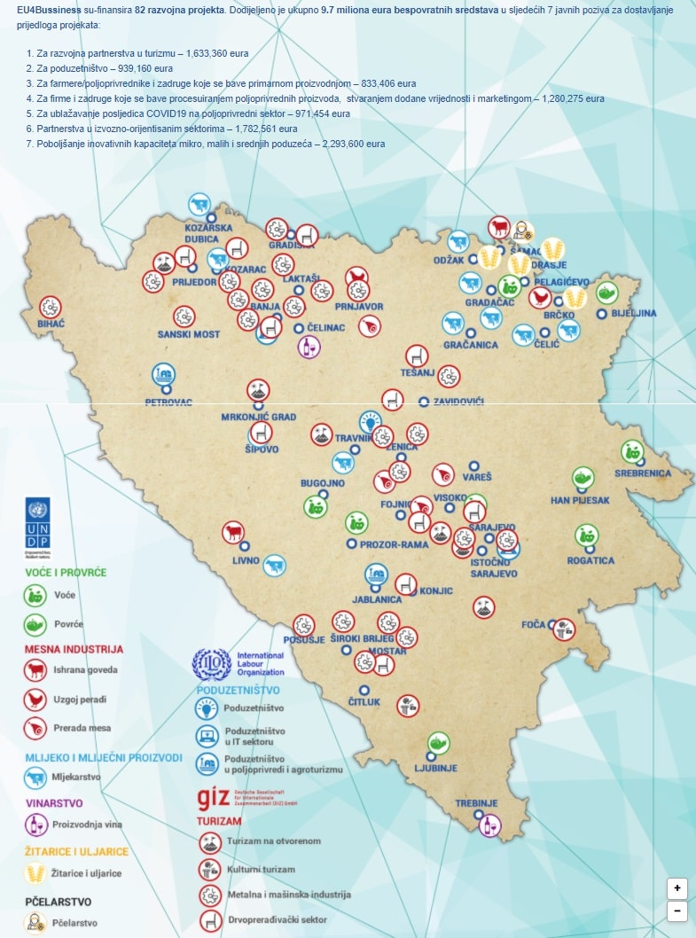Jedan od njih je i program „EU4Business“ u vrijednosti od 16,1 milion evra koji se provodi u periodu od aprila 2018. do marta 2022. godine. Raspodjela novca se vrši kroz pozive za dostavu projekata, a trenutno se realizuju 34 projekta u BiH.