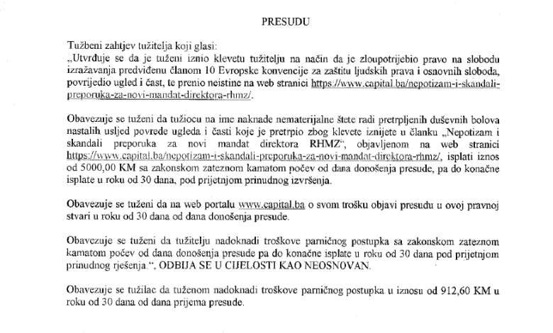 Izražavanje tuženog u odnosu na tužitelja nema klevetničko izražavanje, odnosno ne predstavlja klevetu, koja bi uzrokovala štetu ugledu i dostojanstvu tužitelja. Sud je stoga odredio da se tužbeni zahtjev u cjelosti odbije“, navodi se u presudi.
