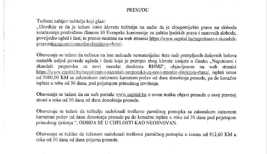 U presudi dalje piše da je istina da se u tekstu navodi “da su naštimani konkursi, zapošljavanje po rodbinskoj liniji te uhljebljenje stranačkih kolega za koje se vežu skandali bili odlična preporuka Darku Borojeviću da dobije novi mandat direktora RHMZ”, ali da treba istaći i to da je tužitelj u to vrijeme zaista bio imenovan i da taj posao radi i danas, a u vrijeme objave teksta predstavlja javnu ličnost i kao takav mora pokazati posebno visok stepen tolerancije.