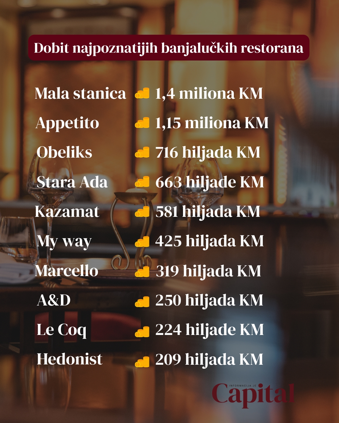 Na vrhu liste kao i ranijih godina je „Mala stanica“. Ovaj restoran koji posluje na više lokacija prošle godine je ostvario prihod od oko 7,7 miliona KM. To je nešto manje nego godinu ranije, ali je zato dobit umanjena sa 1,7 miliona u 2023. godini na manje od 1,4 miliona maraka prošle godine.
