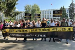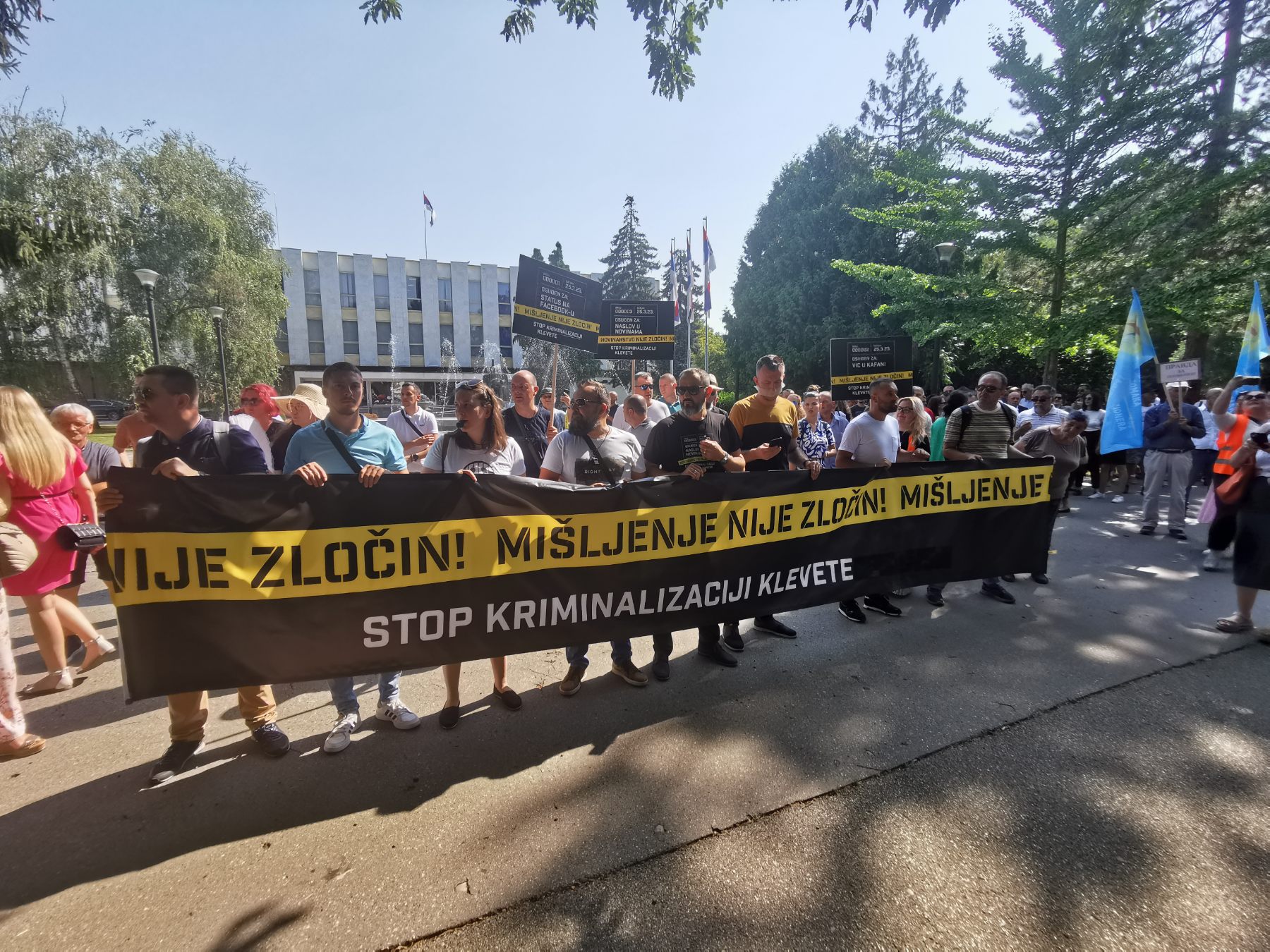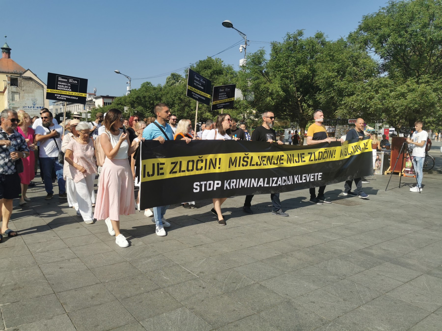 Novinari, predstavnici civilnog društva i brojni građani održali su jutros protest kod megafona na Trgu Krajine i prošetali do Narodne skupštine Republike Srpske zahtijevajući od poslanika da odbace kriminalizaciju klevete, ali su oni to odbacili već na početku zasjedanja.