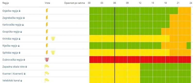 Izdato je narandžasto upozorenje za cijelu zemlju zbog mogućih grmljavinskih nevremena. Samo je na dubrovačkom području na snazi crveno upozorenje na toplinski talas.
