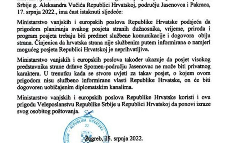 Hrvatske vlasti zabranile su predsjedniku Srbije Aleksandru Vučiću da dođe u privatnu posjetu Jasenovcu a mediji su došli do tog dokumenta.