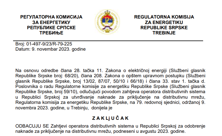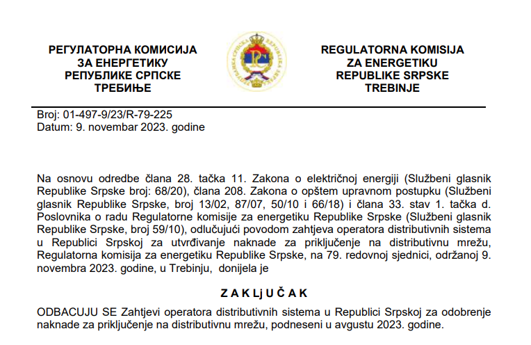 – Ova aktivnost utiče na sve korisnike distributivne mreže, pa kako na one korisnike čiji su objekti već priklјučeni na elektrodistributivnu mrežu tako i na one koji će se ubuduće priklјučivati na mrežu. Zbog toga, ovaj trošak se ne može obračunavati samo budućim korisnicima distributivnog sistema – navodi regulator.