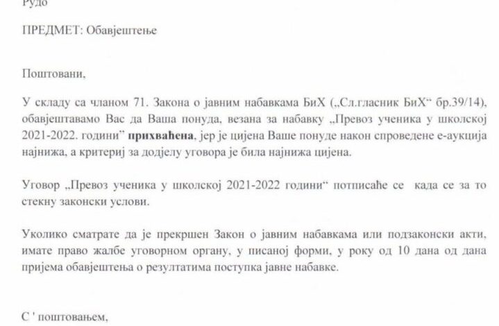 – Imajući u vidu da prvorangirani ponuđač nije dostavio potrebnu dokumentaciju za potpisivanje ugovora, nakon okončane e-aukcije, ponuda se dodijelila drugom ponuđaču – saopštili su iz Opštine Rudo za naš portal, ne navodeći šta od dokumentacije nije dostavljeno.