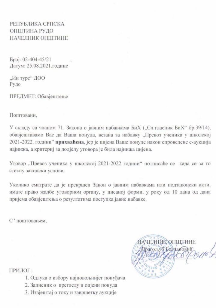 Opština Rudo raspisala je tender za Prevoz učenika za novu školsku godinu tj. 2022/23. U uslovima koji se traže stoji da ponuđač treba da ima jedan uspješno realizovan ugovor u vrijednosti koja nije manja od 55.000,00 KM, čime je pomenuti odbornik zasigurno ispunio jedan uslov.