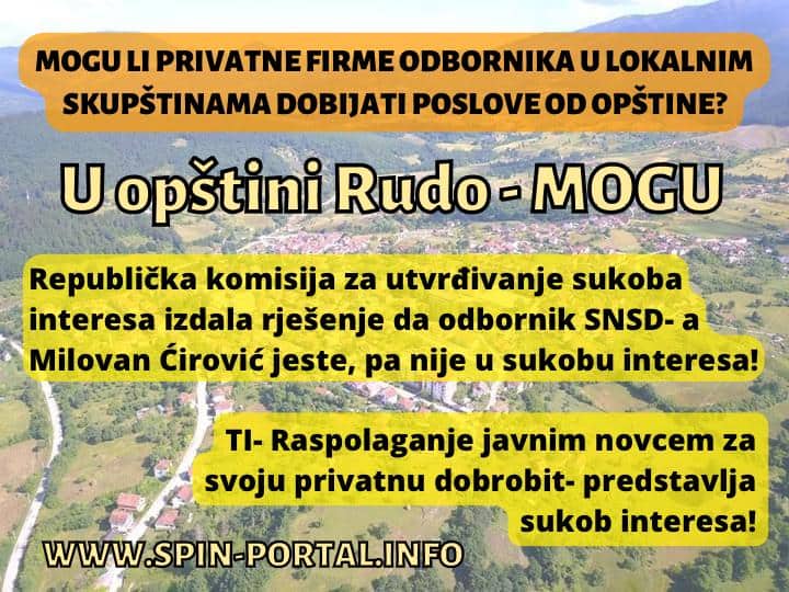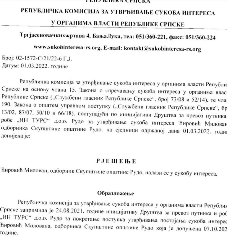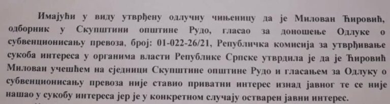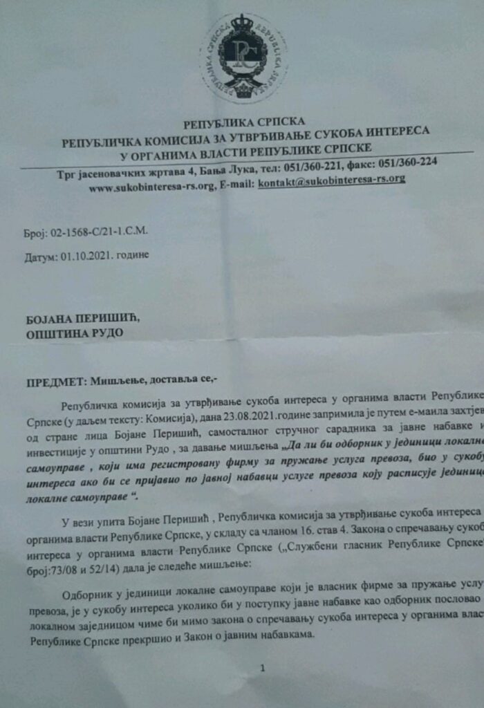 Da su iz opštine Rudo znali da će dodjeljivanjem ugovora odborniku u Skupštini opštine Rudo prekršiti Zakon o sprječavanju sukoba interesa, i opet su to uradili, pokazuje i dopis upućen ranije Republičkoj komisiji od koje se tražilo mišljenje o navedenom slučaju.