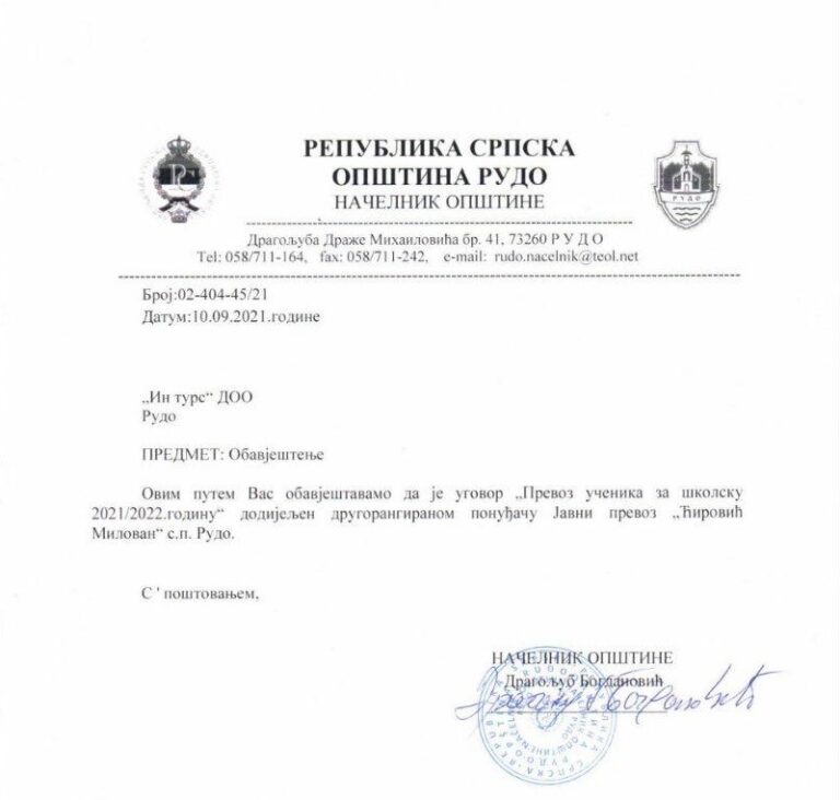 Naime, na tender koji je raspisan prošle godine za prevoz učenika u školskoj 2021/22 godini prijavile su se kompanije “In turs” u vlasništu Marka Novakovića i “Javni prevoz” u vlasništvu Milovana Ćirovića, inače odbornika SNSD-a u Skupštini opštine Rudo.