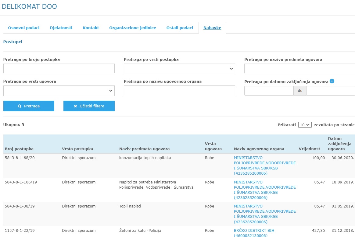 Prema podacima s Portala javnih nabavki u 2018, 2019. te 2020. godini zaključila je više direktnih sporazuma s Ministarstvom poljoprivrede, vodoprivrede i šumarstva Srednjobosanskog kantona, kao i s Policijom Brčko Distrikta. Riječ je, pak, o manjim iznosima.