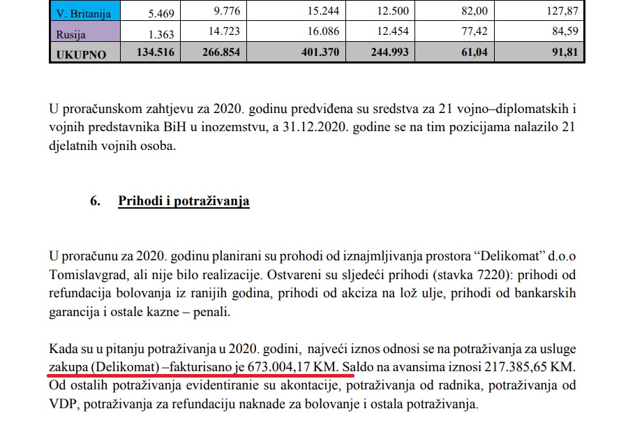 Međutim, „Delikomat“ je s Ministarstvom odbrane BiH u proteklim godinama, dakle za vrijeme mandata Bakovića u Parlamentu FBiH, poslovao sa znatno višim iznosima. Prema izvještaju o izvršenju budžeta Ministarstva odbrane BiH, objavljenom prošle godine, radilo se o prihodima iznajmljivanja prostora za “Delikomat” d.o.o. Ministarstvo odbrane, naime, ima potraživanja od firme „Delikomat“ u 2020. godini u iznosu od čak 673.004 KM. Saldo na avansima, kako su naveli, iznosi 217.385 KM.