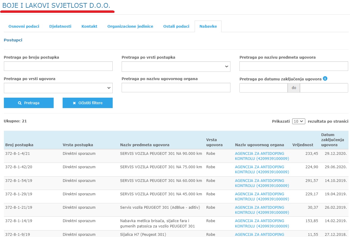 Naime, od 27. decembra 2018. pa do 29. decembra 2020. firma „Boje i lakovi Svjetlost“ s državnom institucijom Agencija za antidopinšku kontrolu BiH potpisala je sedam direktnih sporazuma, i to za sljedeće usluge: nabavka sijalica, metlica brisača i gumenih patosica za Peugeot 301, te servis vozila Peugeot 301. Ukupno su, bez PDV-a, za ove sklopljene direktne sporazume naplaćene 1.174 KM.