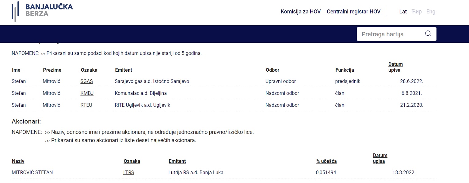 Nadalje, Stefan Mitrović, sin Vojina Mitrovića, prema podacima s Banjalučke berze, trenutno je u nadzornim odborima „Komunalca“, zatim Rudnika i termoelektrane „Ugljevik“, javnog preduzeća koje posluje u okviru Mješovitog holdinga „Elektroprivreda Republike Srpske“.