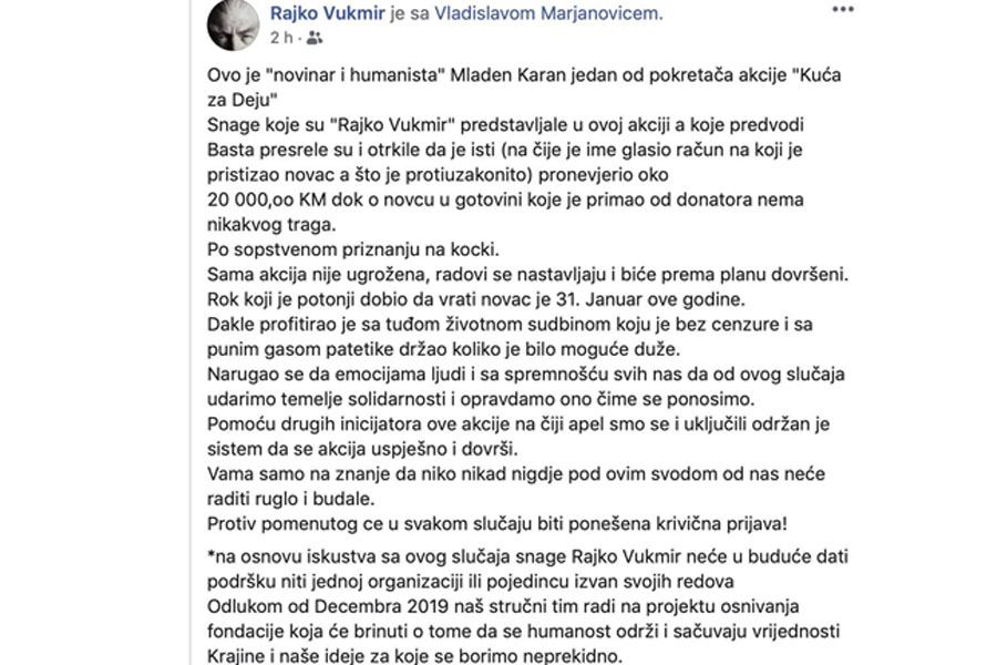 Informacije o Karanovoj prevari i stavljanju “ljage” na jednu od najvećih humanitarnih akcija, koja je okupila region sa ciljem da se izgradi kuća dječaku Dejanu kojeg je ostavila majka, objavljene su i na društvenim mrežama.