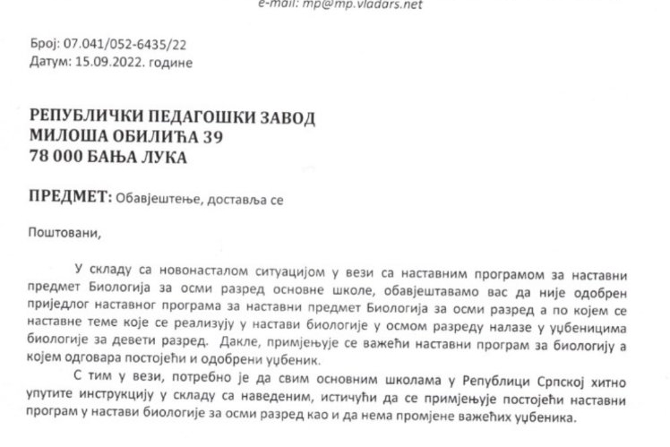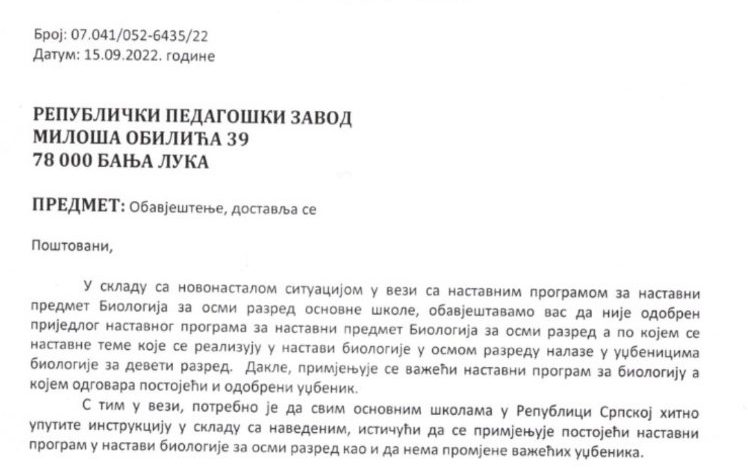 Od RPZ je ujedno zatraženo da hitno uputi instrukciju svim osnovnim školama u Republici Srpskoj, da se primjenjuje postojeći nastavni program u nastavi biologije za osmi razred kao i da nema promjene važećih udžbenika.