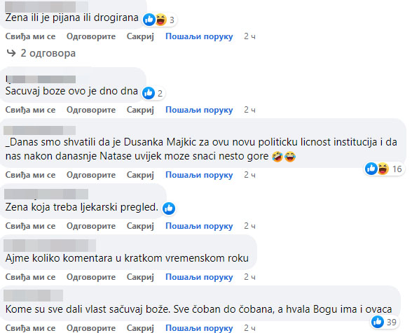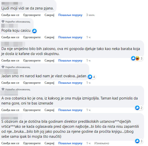 Onaj ko je dozvolio da ovakva osoba predsjedava je gori dikonja od nje. Kad sam je čula samo sam čekala da odnekud se i Zmaj pojavi jer više ništa ne može iznenaditi; Ovo je rijaliti veći od svih”; Nema komentara, pobjednica nekulture, neukusa, nevaspitanja, neznanja i još mnogo ne, ne, ne……..,” komentari su građana koji su pratili sjednicu.
