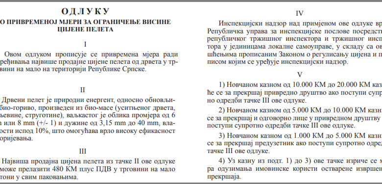 – Najviša prodajna cijena peleta ne može prelaziti 480 КM plus PDV u trgovini na malo po toni u svim pakovanjima. Inspekcijski nadzor nad primjenom ove odluke vrši Republička uprava za inspekcijske poslove posredstvom republičkog tržišnog inspektora i tržišnog inspektora u jedinicama lokalne samouprave – navedeno je u odluci.