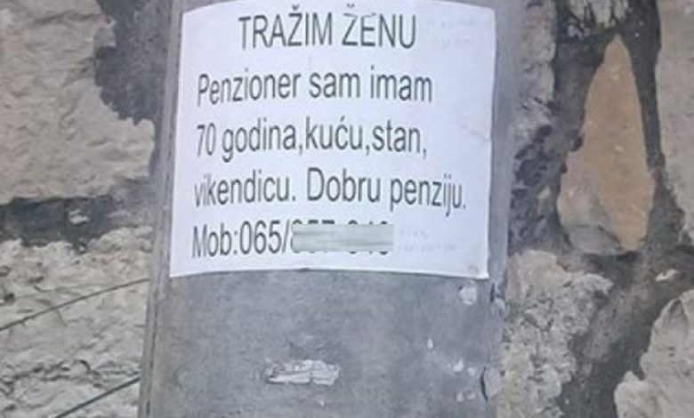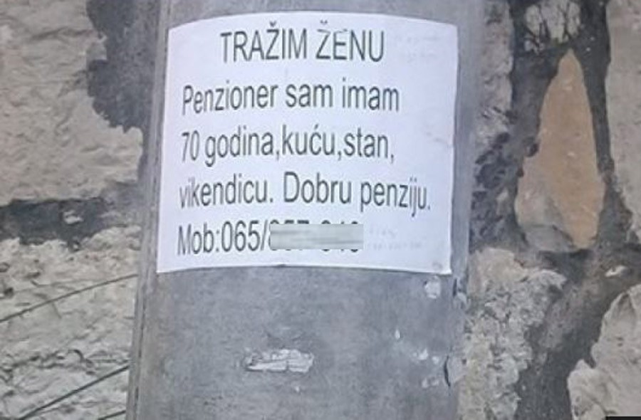 – Tražim ženu. Penzioner sam, imam 70 godina, kuću, stan, vikendicu. Dobru penziju – napisao je nepoznati penzioner, a ostavio je i broj telefona.