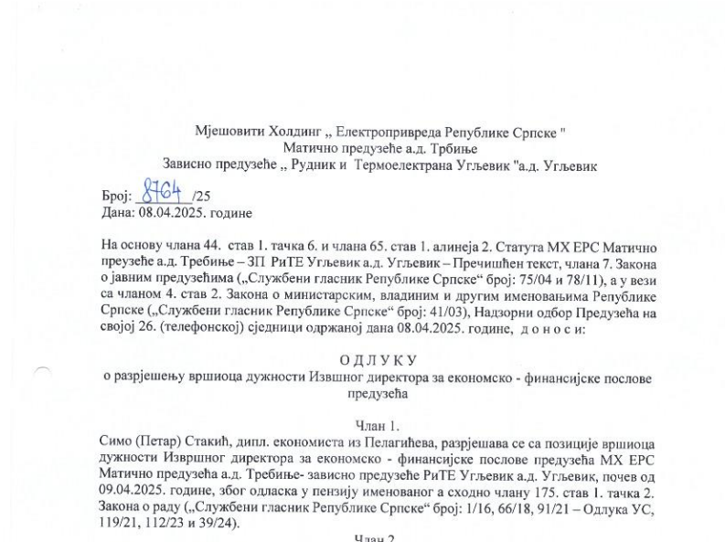 Naime, Nadzorni odbor je 8. aprila ove godine na telefonskoj sjednici donio odluku o razrješenju Stakića sa pozicije vršioca dužnosti izvršnog direktora za ekonomsko – finansijske poslove.