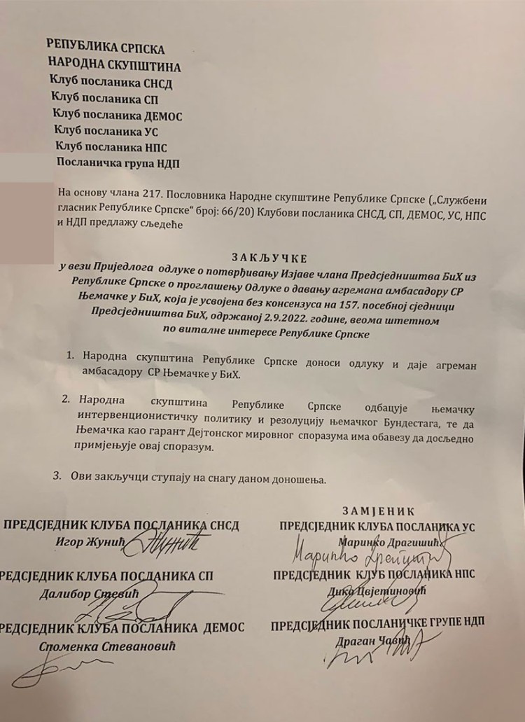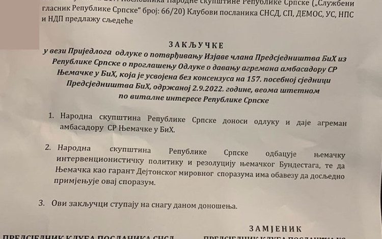 Narodna skupština Republike Srpske donijela je odluku kojom “daje agreman ambasadoru SR Njamačke u BiH”, a za nju su glasali poslanici SNSD, Ujedinjene Srpske, Socijalističke partije, NPS, Demos i NDP.