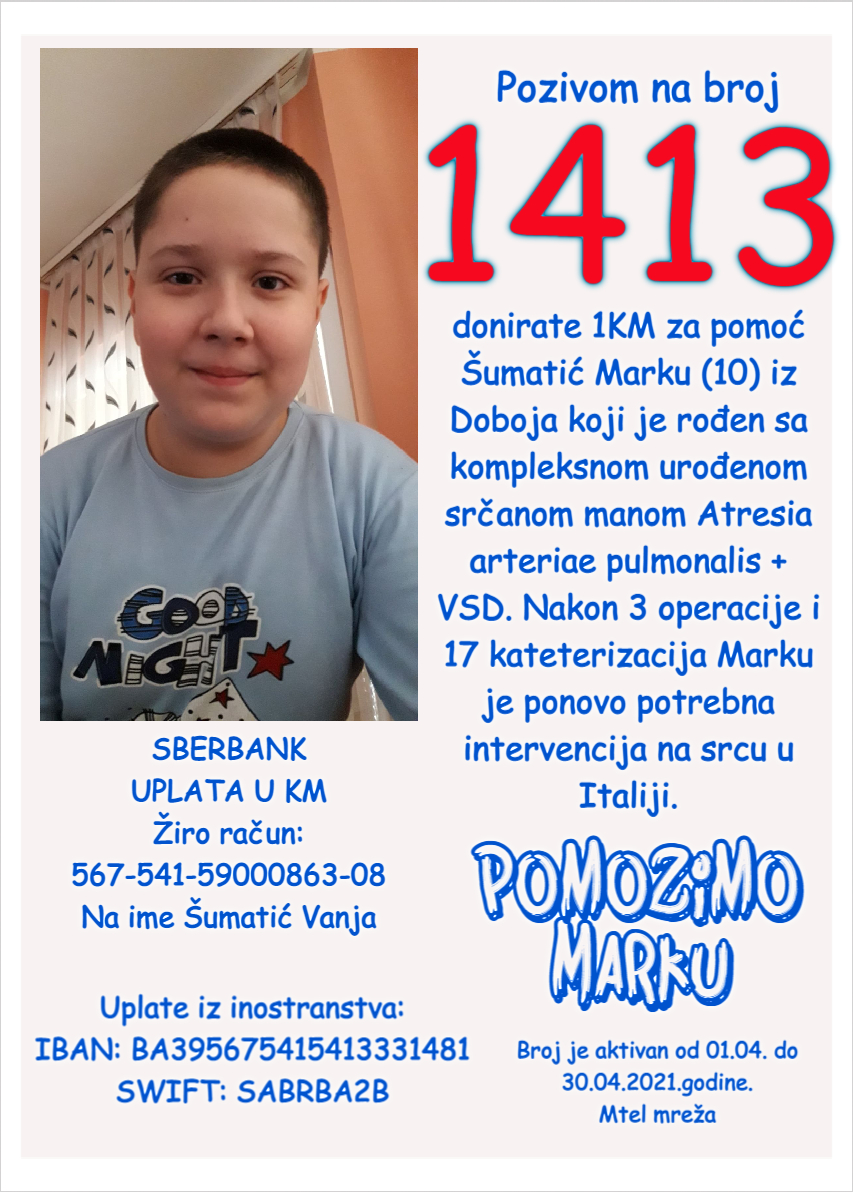 Broj je pokrenut za pomoć u liječenju u Italiji desetogodišnjeg Marka Šumatića iz Doboja koji je rođen sa izuzetno teškom srčanom manom, pomoć za putovanja na redovne kontrole u Italiju i u BiH kao i za sve ostale propratne troškove koji u veliki.
