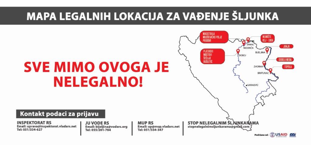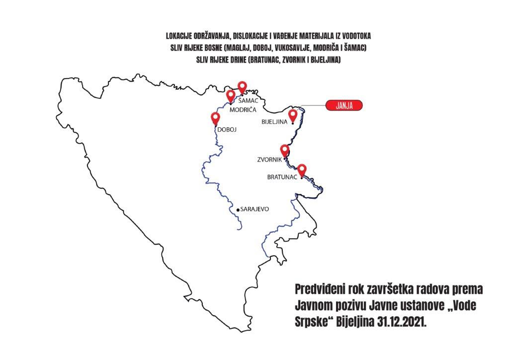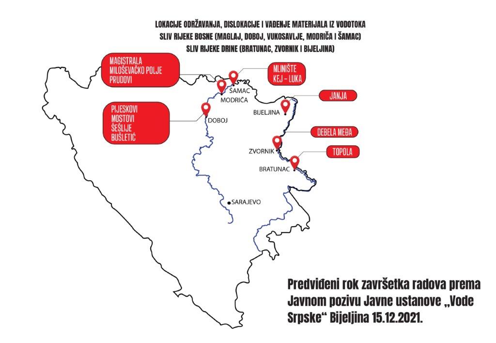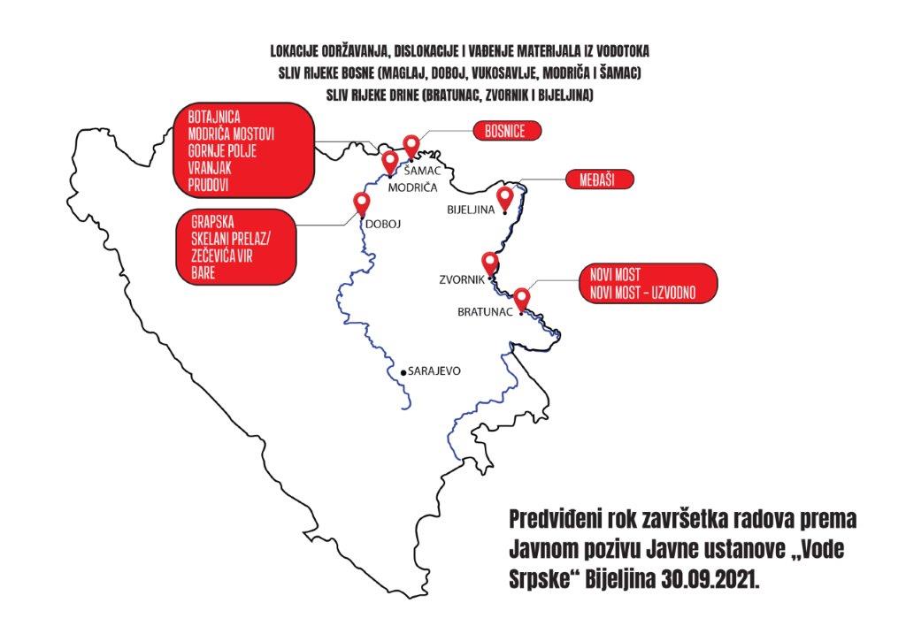 U slivu rijeke Bosne od Doboja do Šamca za vađenje i dislokaciju vodnog materijala legalnih je 17 lokacija po Javnim pozivima JU „Vode Srpske“ sa odobrenim rokovima izvođenja radova 30.septembar, 15.decembar i 31.decembar, a dio je rokova pomjeren do 1. aprila iduće godine zbog ranijih nepovoljnih vremenskih uslova i viših vodostoja rijeka.